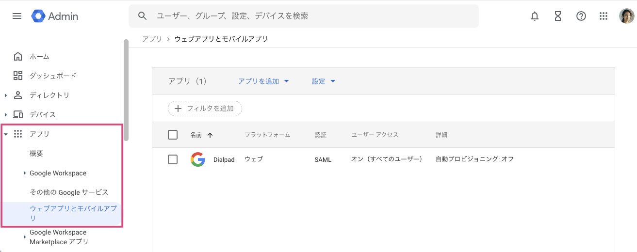 はじめに、Google Workspace SAML アプリにて、Dialpad アプリを検索して、追加を完了します。