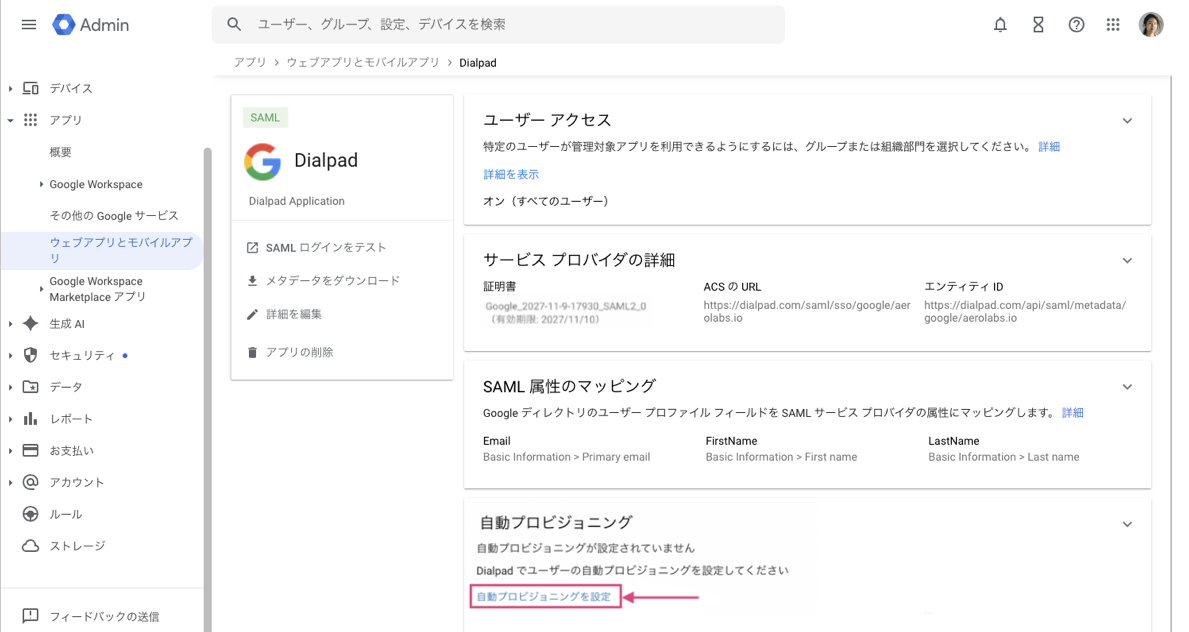 Googl Workspace で追加した Dialpadの設定にて、[ 自動プロビジョニング] > [自動プロビジョニングを設定]を開きます。