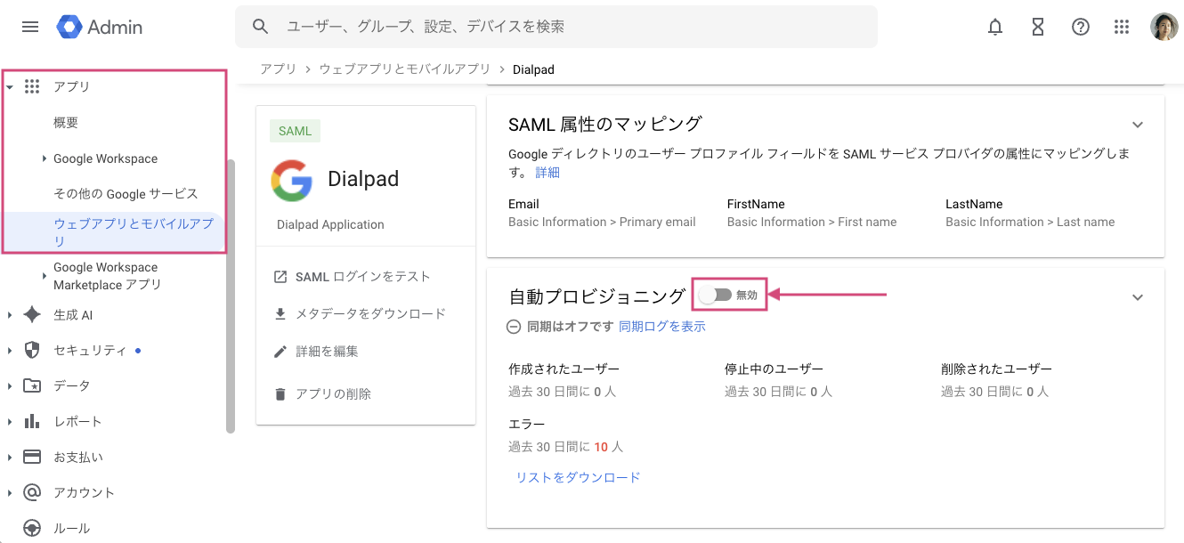 すべてのユーザープロビジョニングの設定が完了したら、Dialpadへのユーザー自動プロビジョニング機能を有効にします。