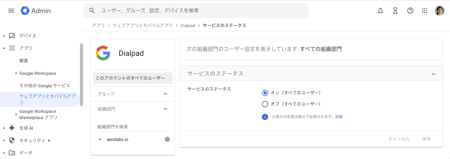 Google 管理者コンソールより、[アプリ] > [ウェブアプリとモバイルアプリ] から [Dialpad] を開きます。