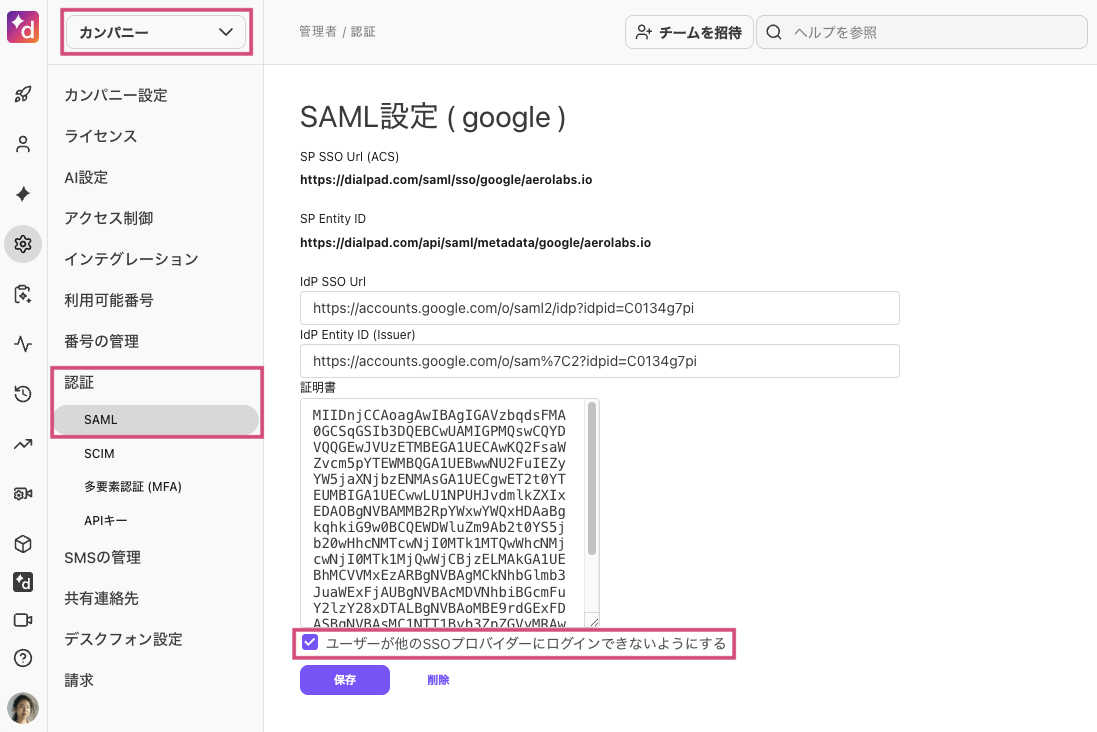 上記にて、他の SSO プロバイダーのログインを無効にすると、設定した SSO 以外、またはメールアドレスとパスワード認証にて、Dialpad へのログインはできなくなります。