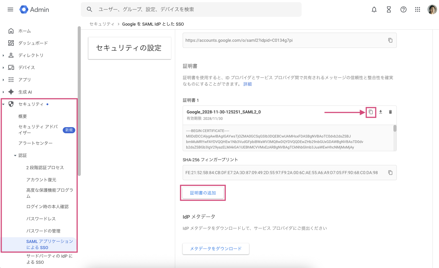 [セキュリティ] > [認証] > [SAML アプリケーションによる SSO] へ行きます。