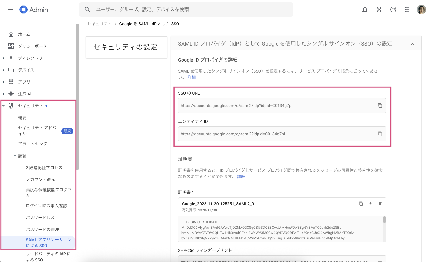まず、Google を SAML アイデンティティプロバイダー (IdP) として使用できるように SSO (シングルサインオン) を設定します。