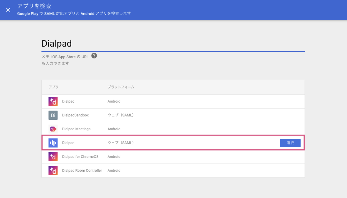 リストから [Dialpad] の項目を選択します。[Google IdP 情報] ページの値が自動的に入力されます。