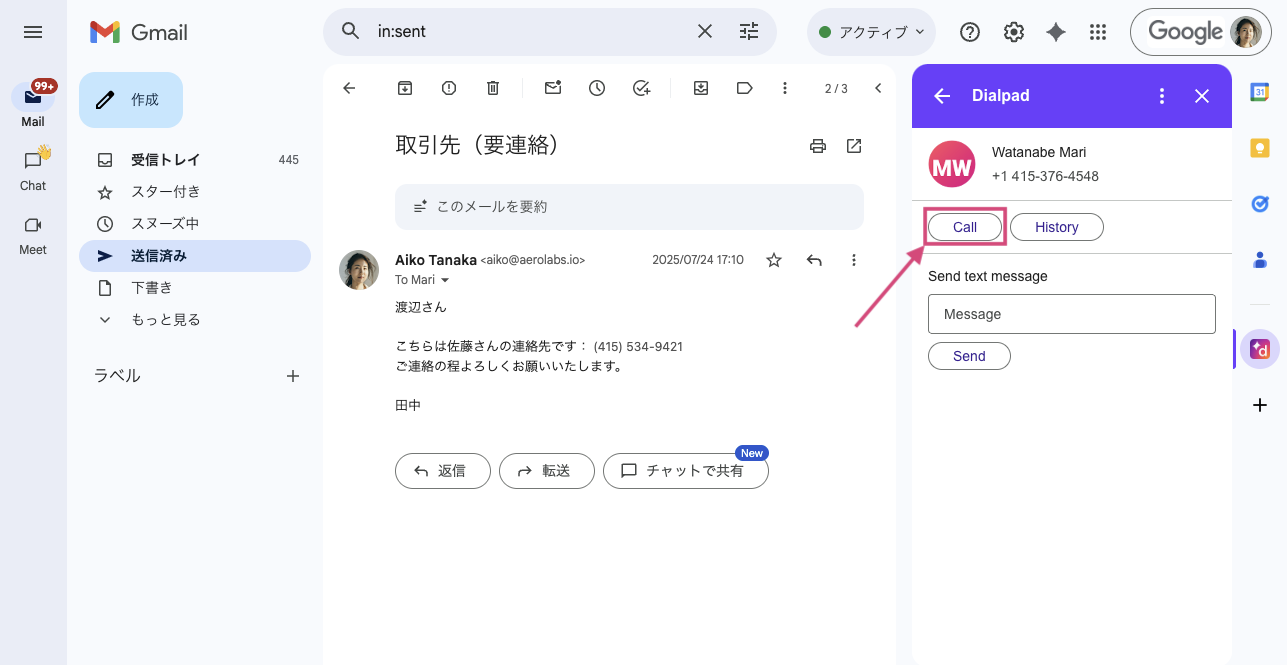 アドオンをダウンロード後、メールを開くと右側に Dialpad アイコンが表示されます。アイコンをクリックすると、メールのスレッドに含まれるすべての Dialpad 連絡先が表示されます。
