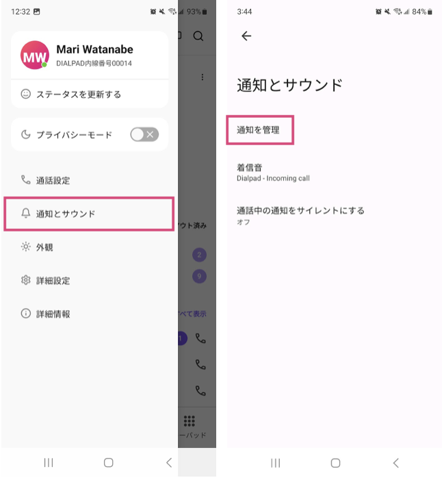 Dialpad モバイルアプリより、[設定] > [通知とサウンド] > [通知を管理] を開き、必要な通知オプションをオンにします。