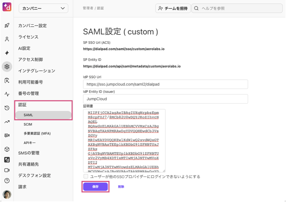 Dialpad SAML 画面([カンパニー] > [認証] > [SAML] > [custom]) に戻ります。