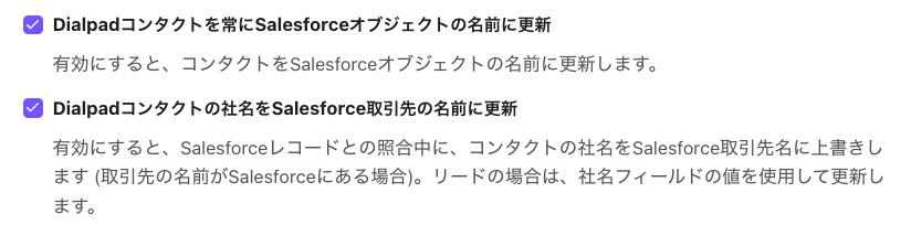 Dialpad と Salesforce のコンタクトを常に最新の状態に保ため、コンタクト名と社名を自動更新する設定を有効にします。