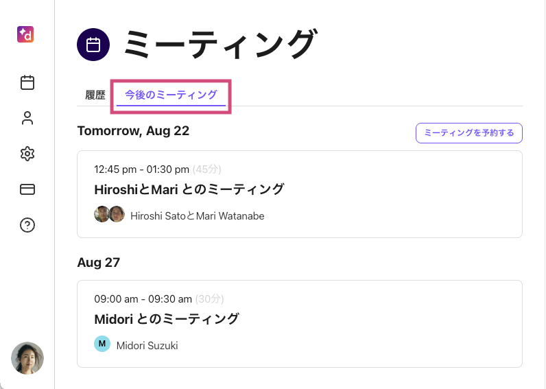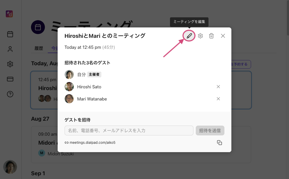 予約ずみのミーティングのタイムゾーンを編集するには、Dialpad Meetings ダッシュボードを開きます。