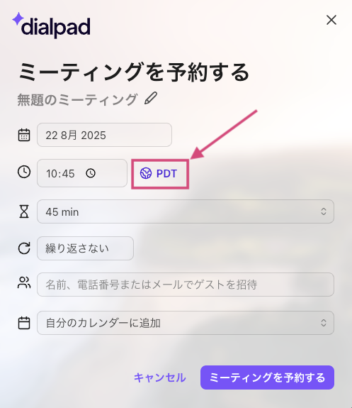 Dialpad Meetings(ベータ版)のタイムゾーンを現在地に合わせて設定することで、ミーティングを見逃すことはありません。
