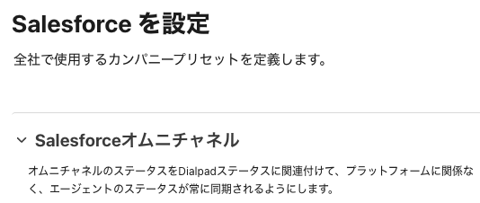 Salesforce オムニチャネルのステータスを Dialpad のステータスとマッピングすることで、エージェントのステータスがプラットフォーム間で同期されます。オムニチャネルは、エージェントの対応可能ステータスと処理能力に基づいてケースやリードなどの作業を割り当てる機能です。