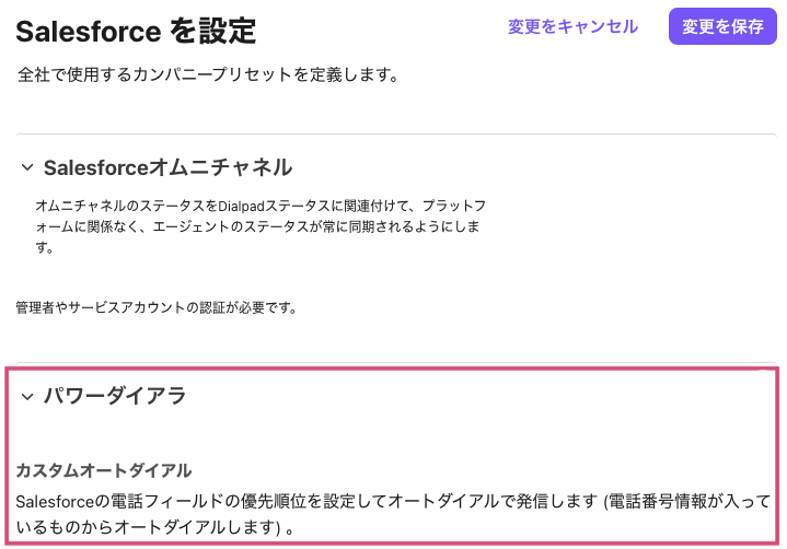 Dialpad 管理者画面で、オフィスに対して Salesforce インテグレーションを有効にします。
