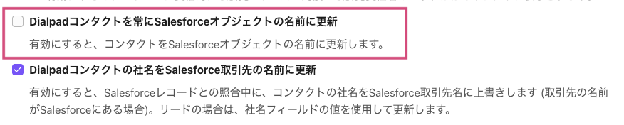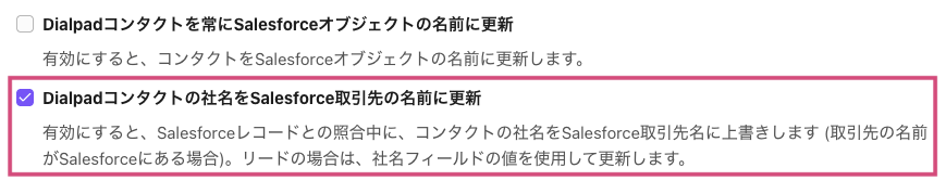 [Dialpadコンタクトを常にSalesforceオブジェクトの名前に更新] を有効にすると、通話に紐付くSalesforce オブジェクト名に合わせて、Dialpad の連絡先名が常に更新されます。この設定は、他の自動マッチング設定よりも優先され、無効にするにはチェックを外す必要があります。
