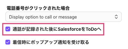 [通話が記録された後にSalesforceをToDoへ] を有効にすると、通話がログされた後、自動的に新しく作成されたタスク画面へ移動されます。これにより、ログの確認、編集、詳細追加を行い、記録の正確性が維持されます。