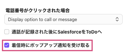 [着信時にポップアップ通知を受け取る] を有効にすると、着信があった際に Salesforce 上にポップアップ通知が表示されます。これにより、着信を見逃すことなく、通知からすぐに応答などのアクションを行えます。