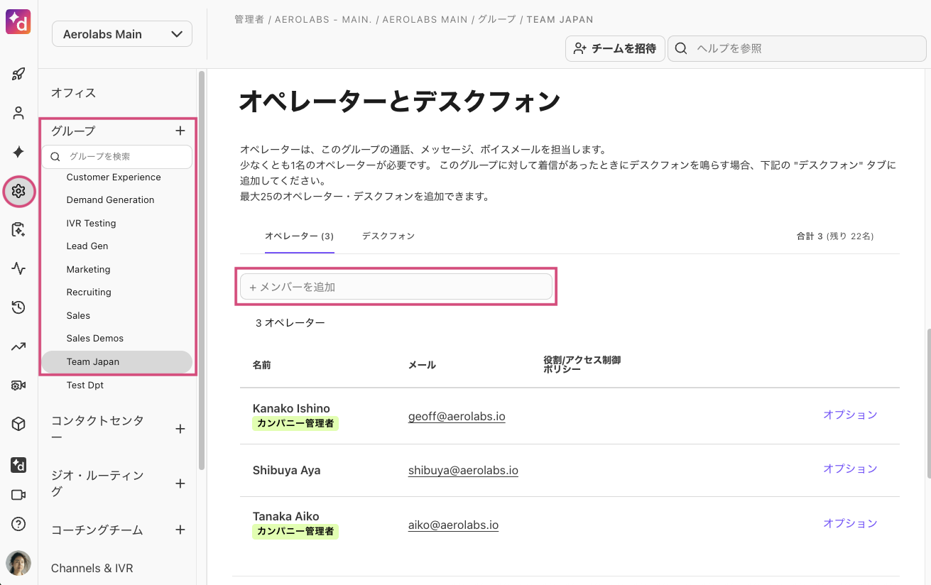 グループの [オペレーターとデスクフォン] 、またはコンタクトセンターの [エージェントと管理者] に移動します。
