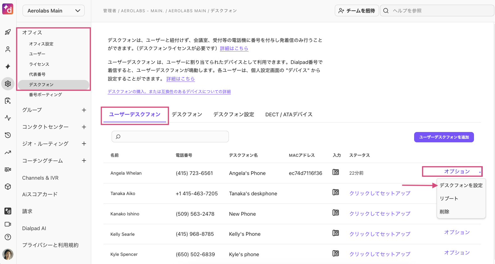 [ユーザーデスクフォン] タブでユーザーのデスクフォンを選択します。