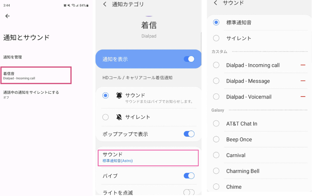 画面左上のプロフィールをタップ > [通知とサウンド] > [着信音] より、別の着信音へ変更すると音がなりますか?