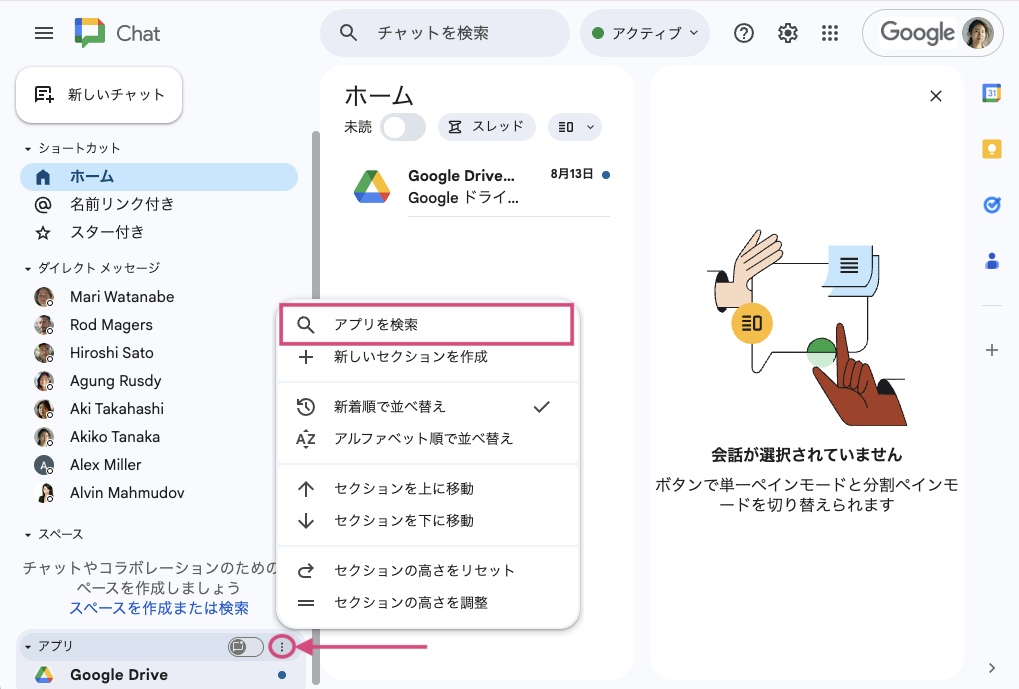 利用開始するには、Google Chat サイドバーから @Dialpad アプリを検索・追加する必要があります。