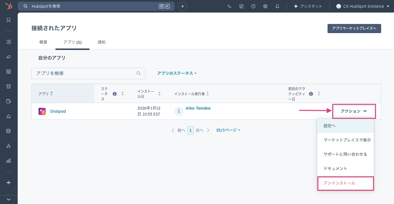 Dialpad 側で HubSpot 連携を解除した後、HubSpot アカウントにアクセスしてアンインストール作業を完了します。