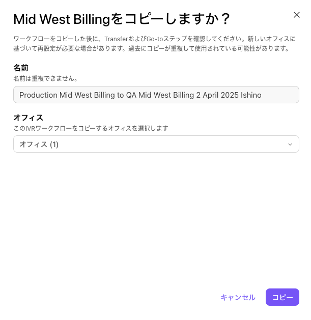 IVR ワークフローをコピーする際、ワークフロー内で使用される名前は、それぞれのオフィスごとに一意である必要があります。