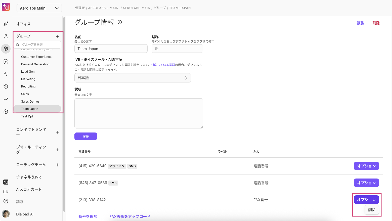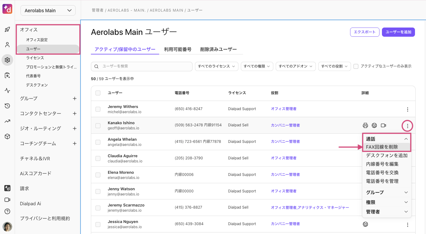 FAX 番号ライセンスを購入すると、個人番号および共有番号に FAX 番号を追加・削除できるようになります。