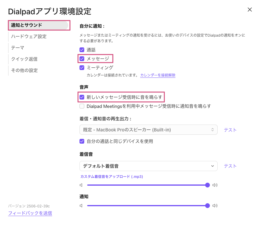 [新しいメッセージ受信時に音を鳴らす] のチェックボックスをオンにします。