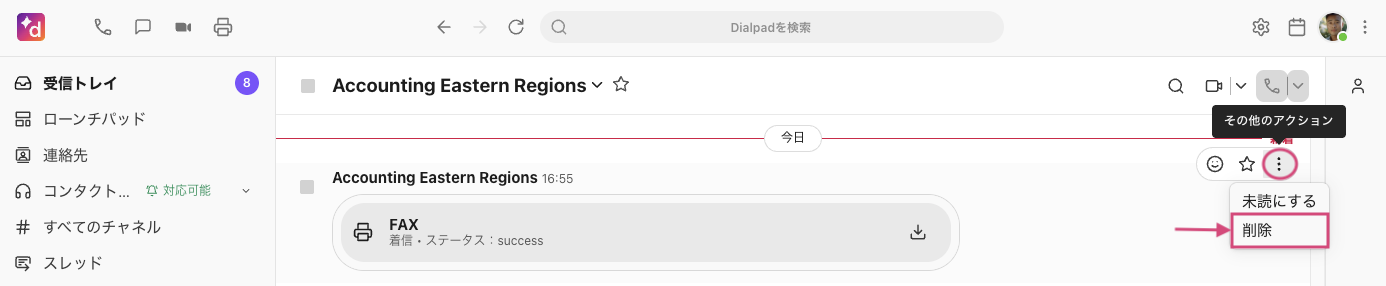 会話画面で FAX 通知にカーソルを合わせ、[その他のアクション](縦の 3 つの点)を選択します。