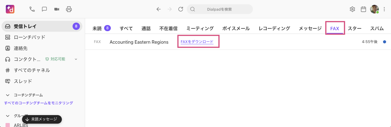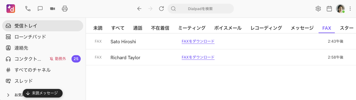 リアルタイムの通知を見逃した場合でも、FAX は受信トレイの [未読] タブ および [FAX] タブに表示されます。