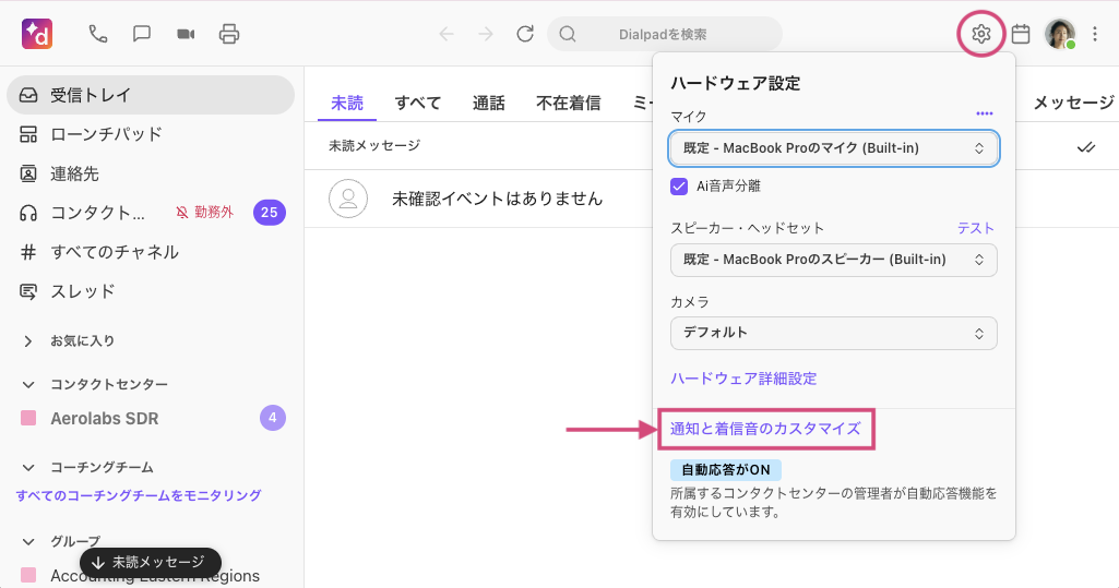 共有番号のメール通知を設定するには、 Dialpad の管理者設定を開きます。以下の手順は、代表番号を例に説明しています。