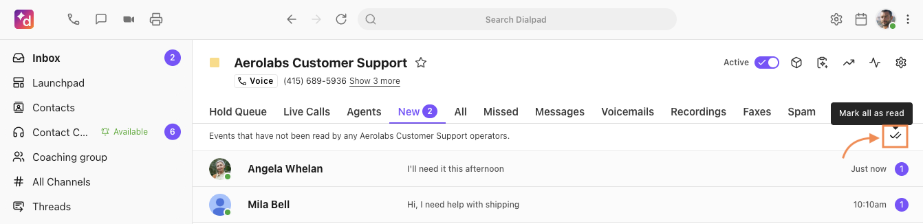 To clear unread messages for a Contact Center or a Department, click the double-checkmark icon to mark all as read.