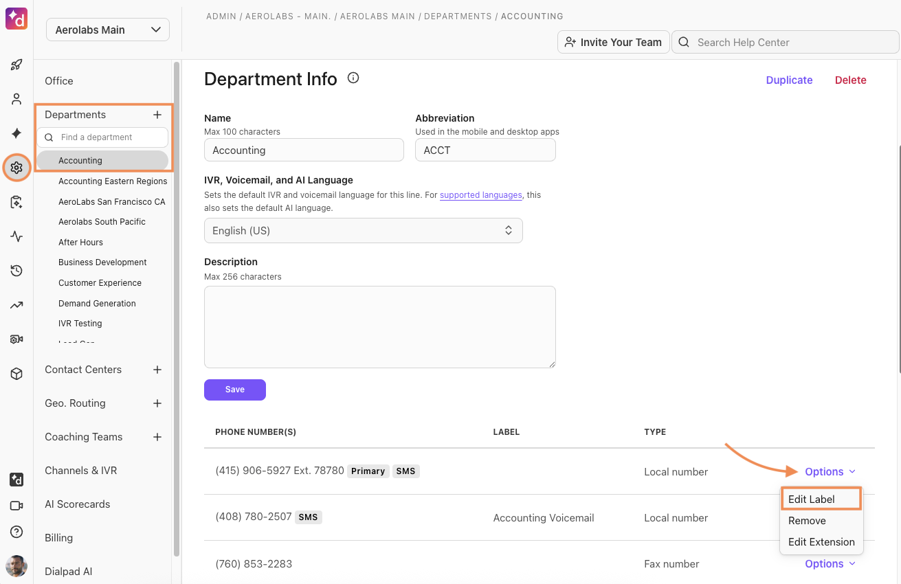 Use labels on your Mainline, Department, and Contact Center numbers so your agents know where transferred calls are coming from.
