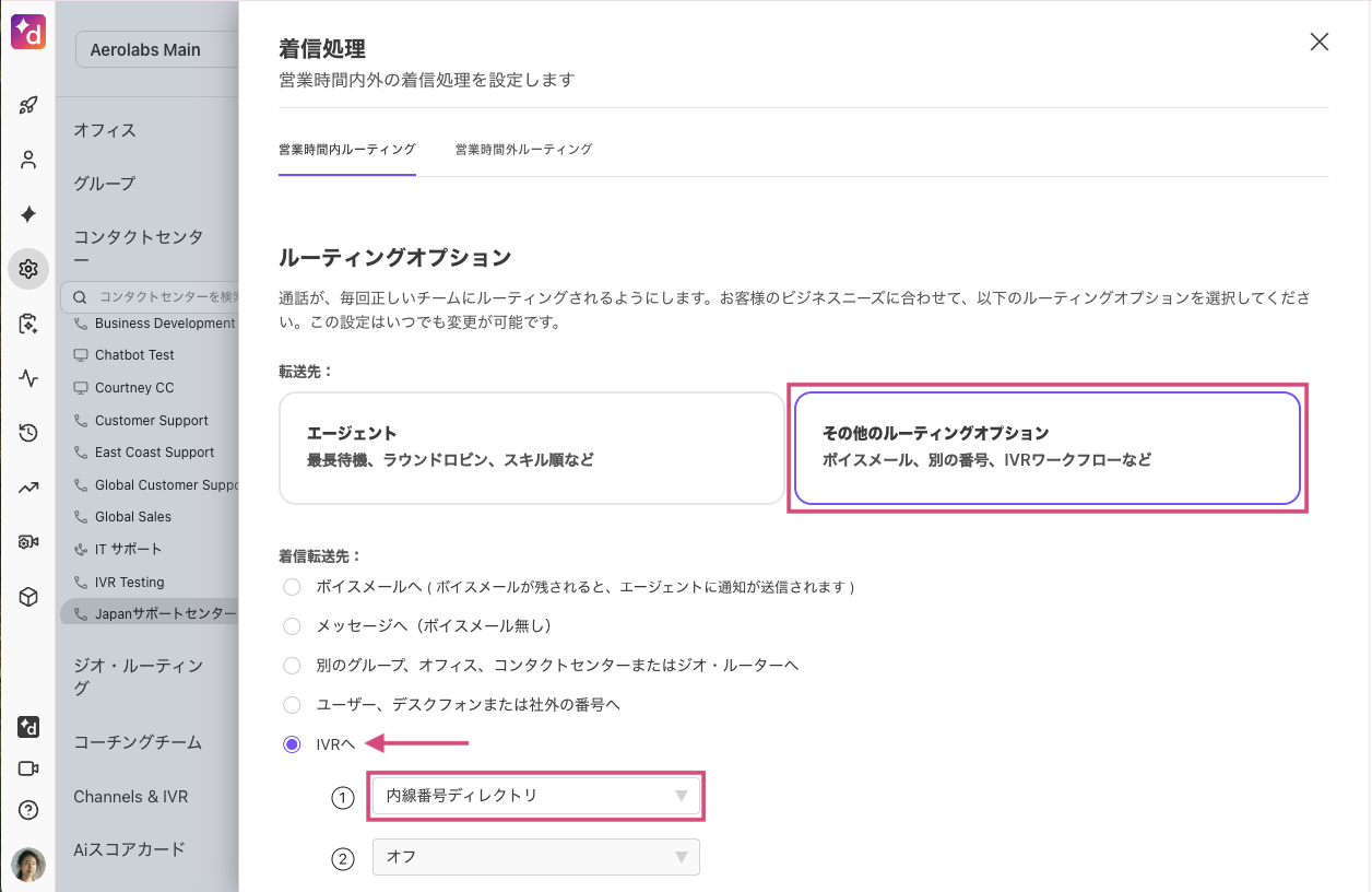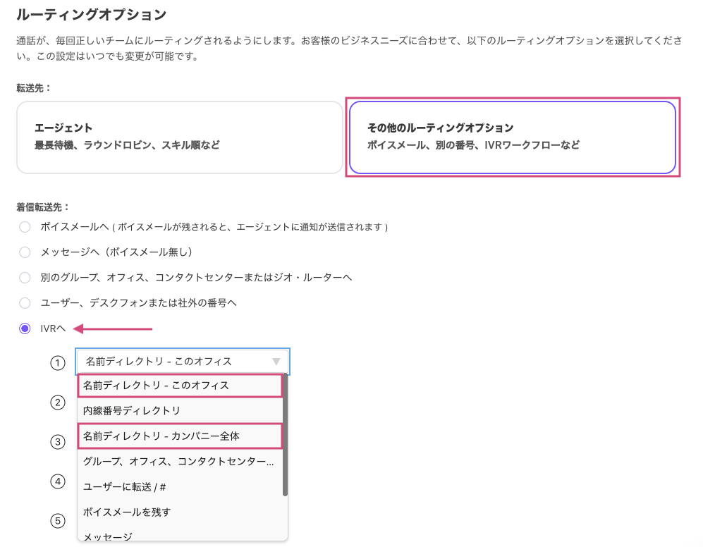 5. [IVR へ] を選択し、名前ディレクトリのタイプを選択します。