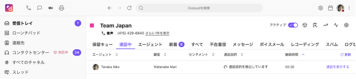 [通話中] タブでは、現在オペレーターが対応中の通話を表示します。このタブは下記を含みます: