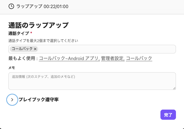 通話終了後、通話タイプを入力して通話フローを完了します。(参照:通話タイプの設定)