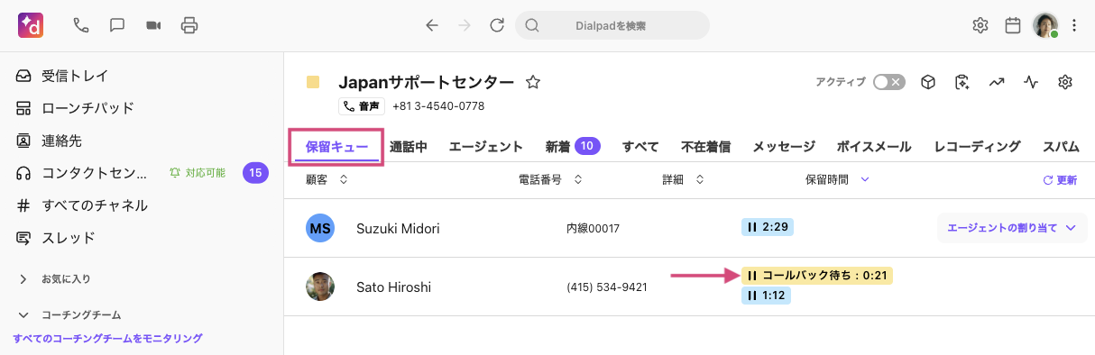 キュー内の通話は変更なく上から順番に対応され、発信者の順番になると、Dialpad が発信者へコールバックを実行します。
