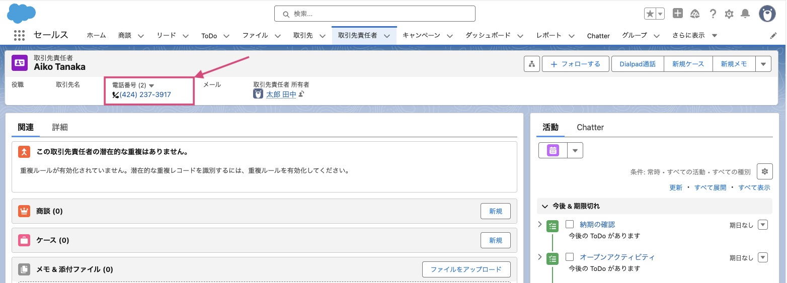 Chrome クリックコールにより、Salesforce 画面で電話番号がハイパーリンク表示され、番号をクリックすることで直接 Dialpad アプリから発信できます。