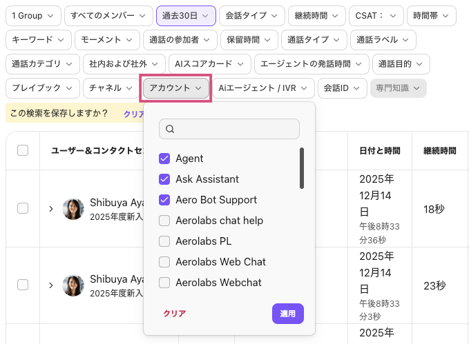 [アカウント] フィルターを使用すると、アカウントに基づいて会話を検索できます。