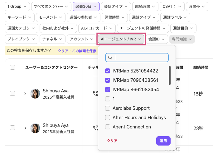 [AI エージェント/ IVR ] フィルターを選択します。