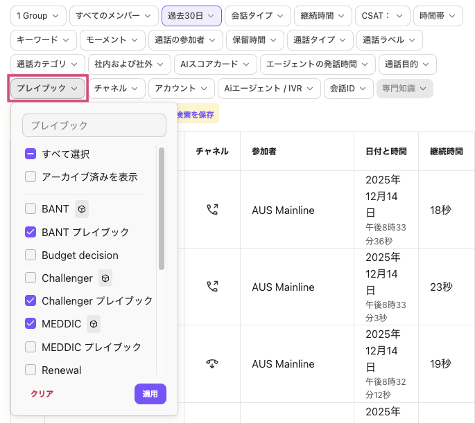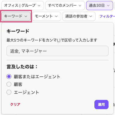 [キーワード] フィルターでは、特定のキーワードで絞り込むことで、通話のトーンを簡単に把握できます。