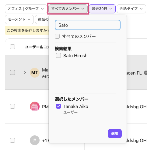 オフィスやグループで絞り込んだ後に、[メンバー] フィルターを使って特定のユーザーでさらに絞り込むことができます。