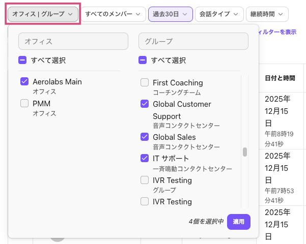 特定のオフィスやグループの通話でフィルターするには: