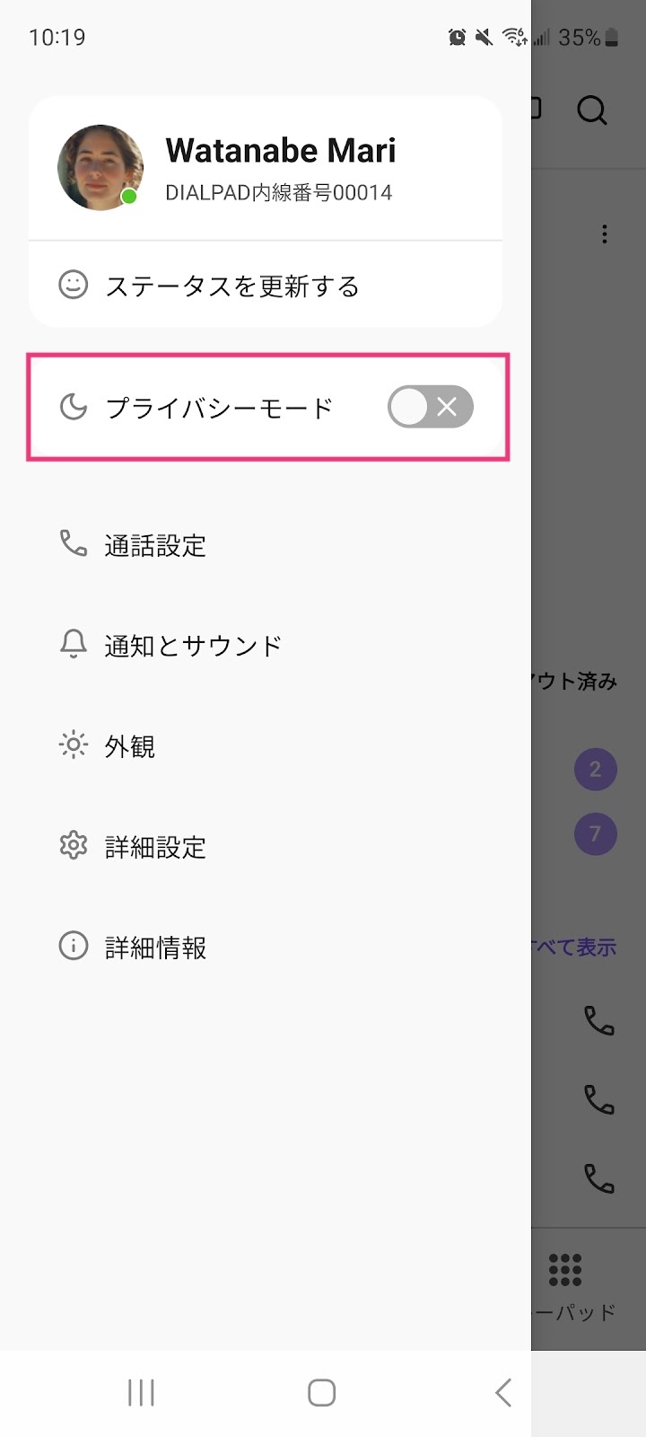 自動で認証されない場合、[認証] をタップすると Dialpad から自動音声を着信します。1を押すように音声が流れますので、1をタップしてください。
