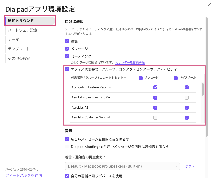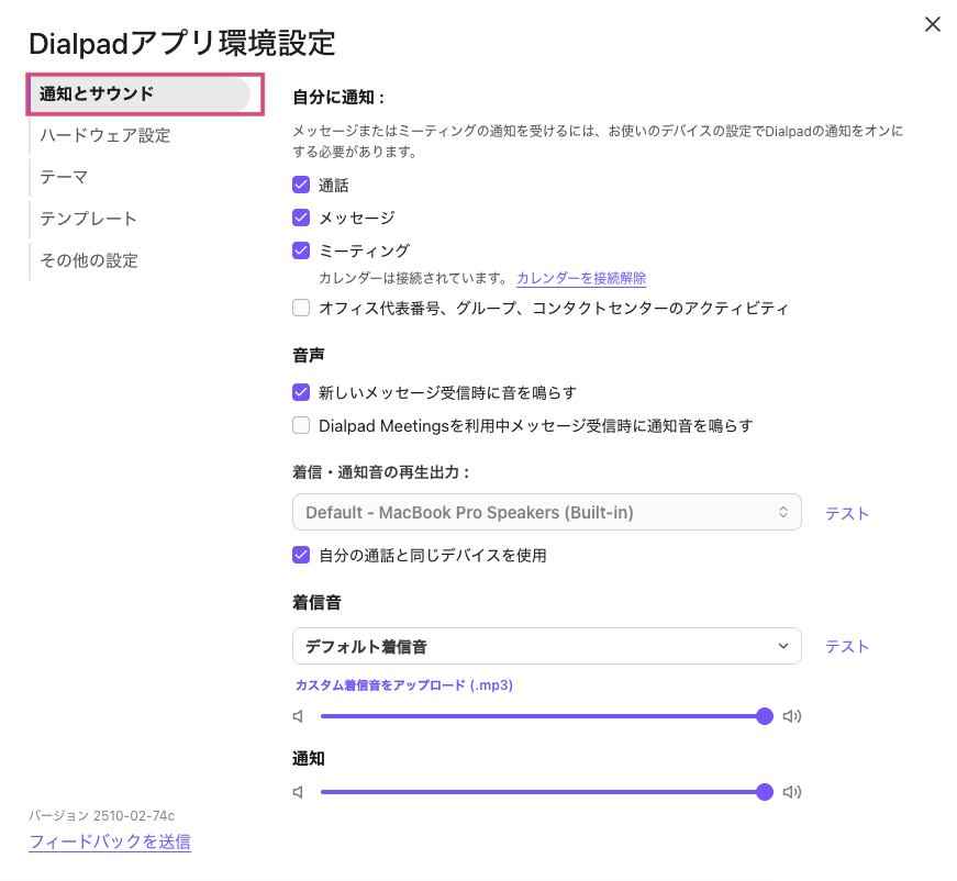 通知とマイクの音量は手動で調整、また Dialpad の自動音量機能を使用した音量調整が可能です。音量設定は、冒頭のハードウェア設定メニュー、あるいは以下アプリ設定の [環境設定] から設定できます。