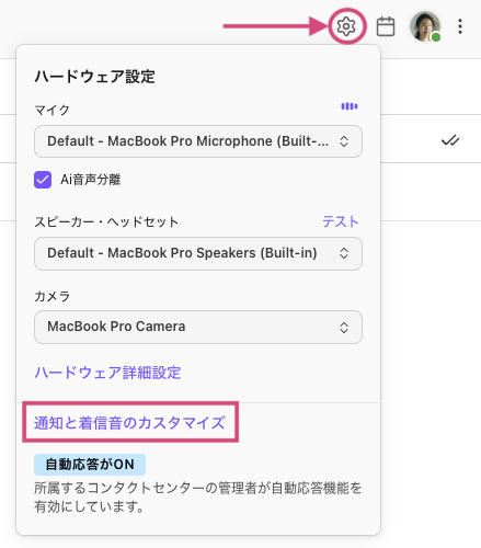 このポップアップ メニューでは、マイク、スピーカー/ヘッドセット、カメラの設定に簡単にアクセスできます。更に詳細設定をするには、[ハードウェア詳細設定] 、[通知と着信音のカスタマイズ] をします。