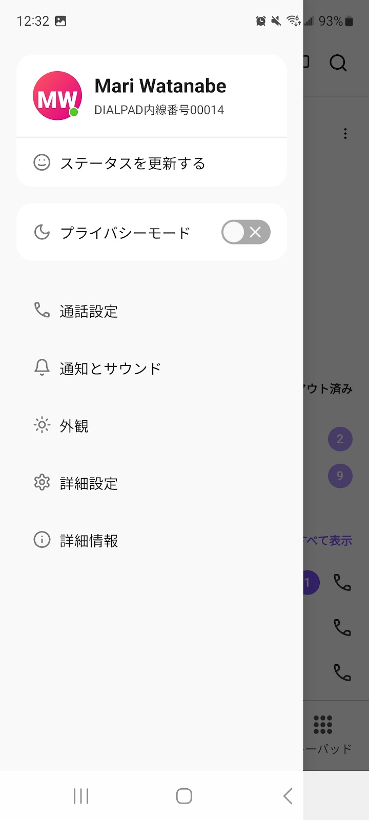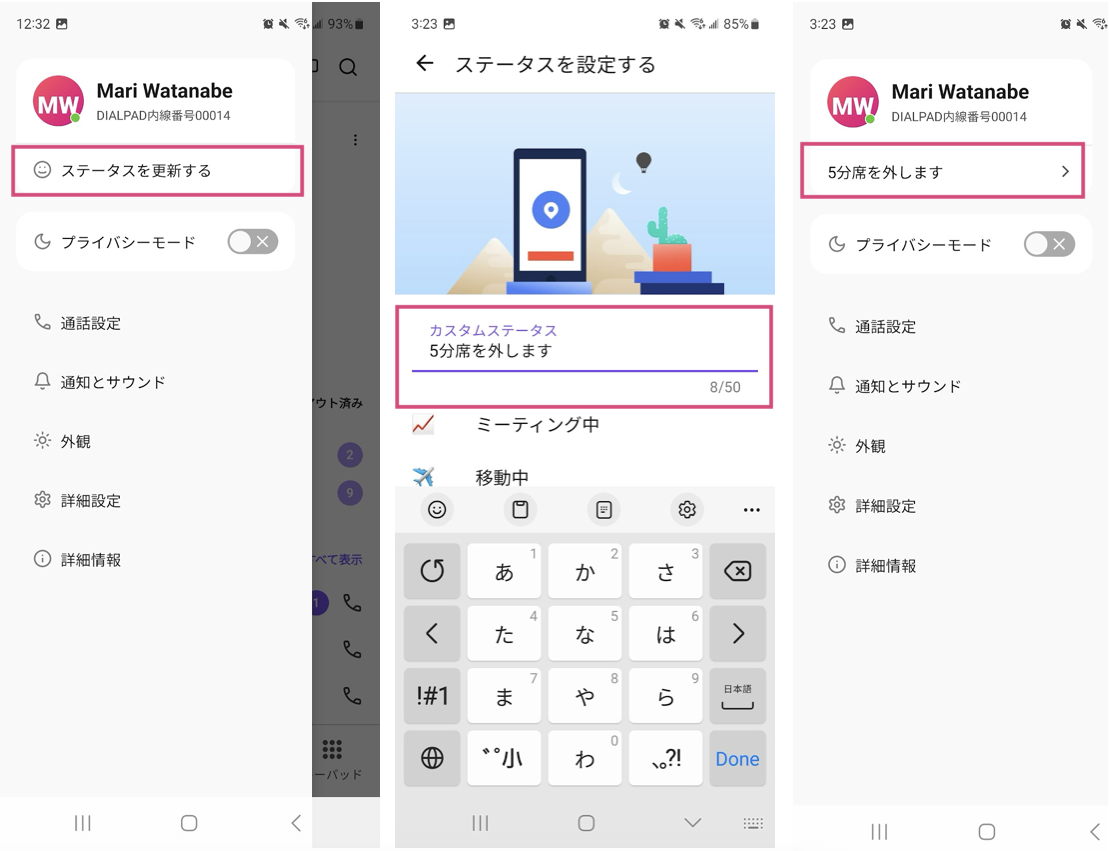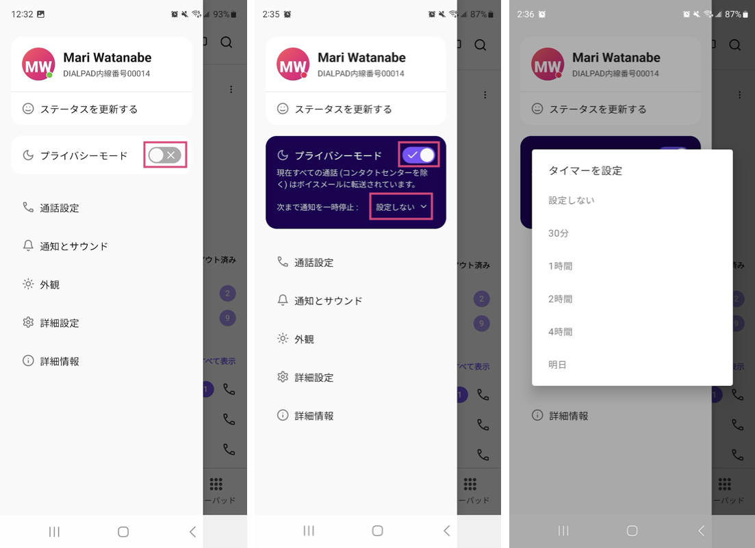 プライバシーモード中に着信した電話はそのままボイスメールに送られます。また、カスタムステータスを表示して、不在やプロジェクトに取り組み中ほか、自分のステータスを相手に知らせることができます。