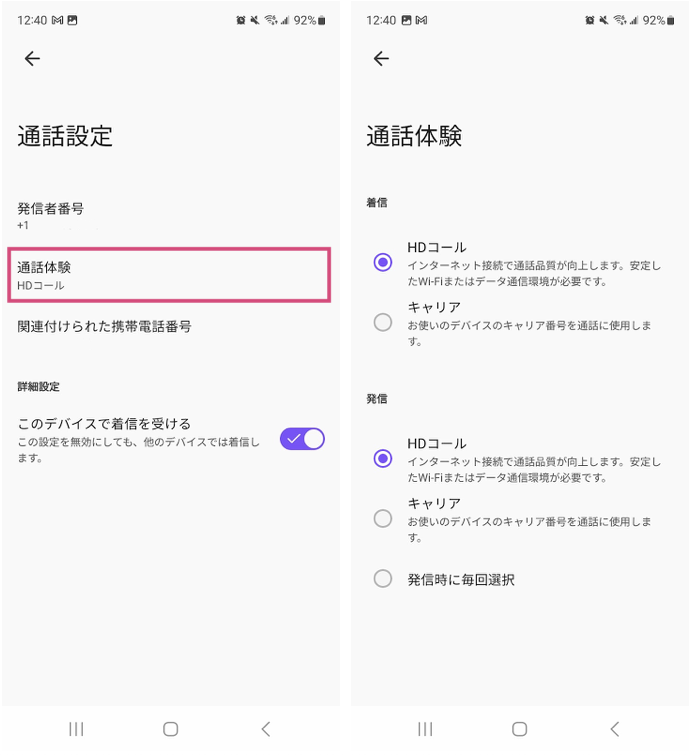 HD コール設定は、通話の着信、発信にインターネット接続を使用します。安定したモバイルネットワーク、または Wi-Fi ネットワークに接続いただくいことで、高い通話品質で通話が実行されます。