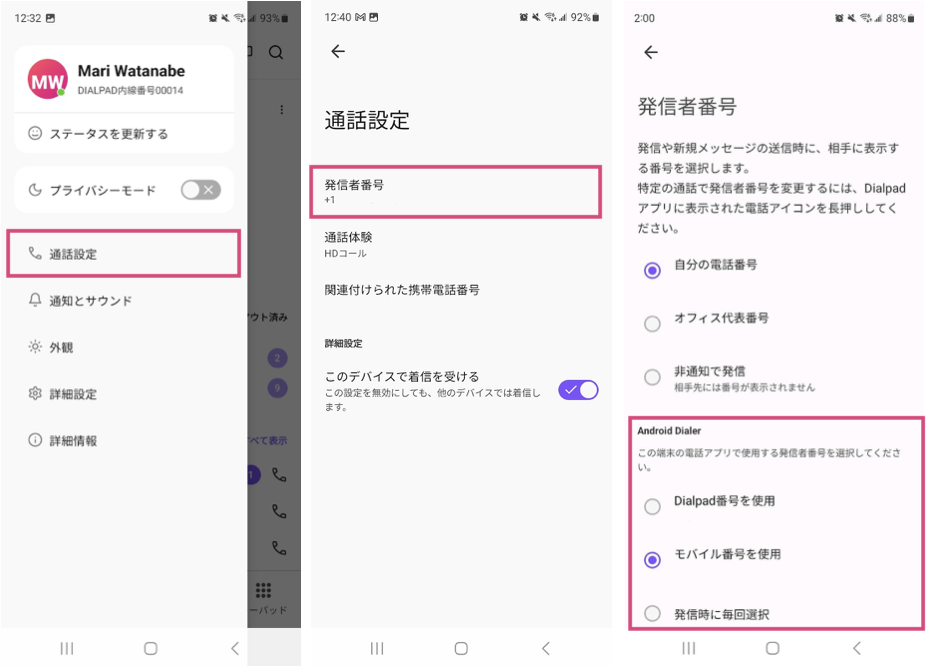 端末の電話アプリ(ネイティブ)から発信する場合、モバイル番号を使用するか Dialpad 番号使用するかを選択できます。デフォルトではモバイル番号が選択されています。