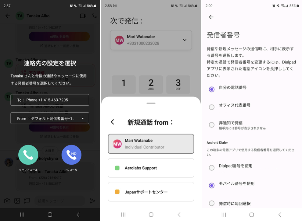 発信時に毎回選択 | 発信時に、Dialpad 番号かキャリア発行の自身の番号を選択することができます |