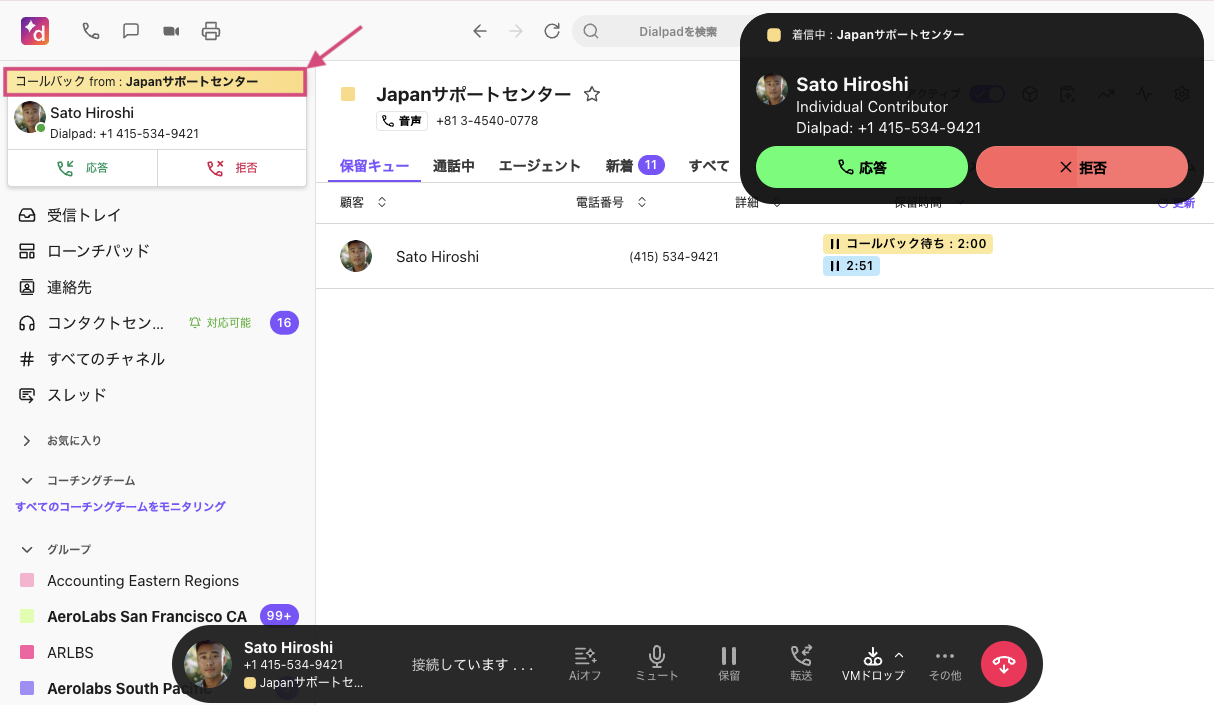 キュー内の通話は変更なく上から順番に対応され、発信者の順番になると、Dialpad が発信者へコールバックを実行します。